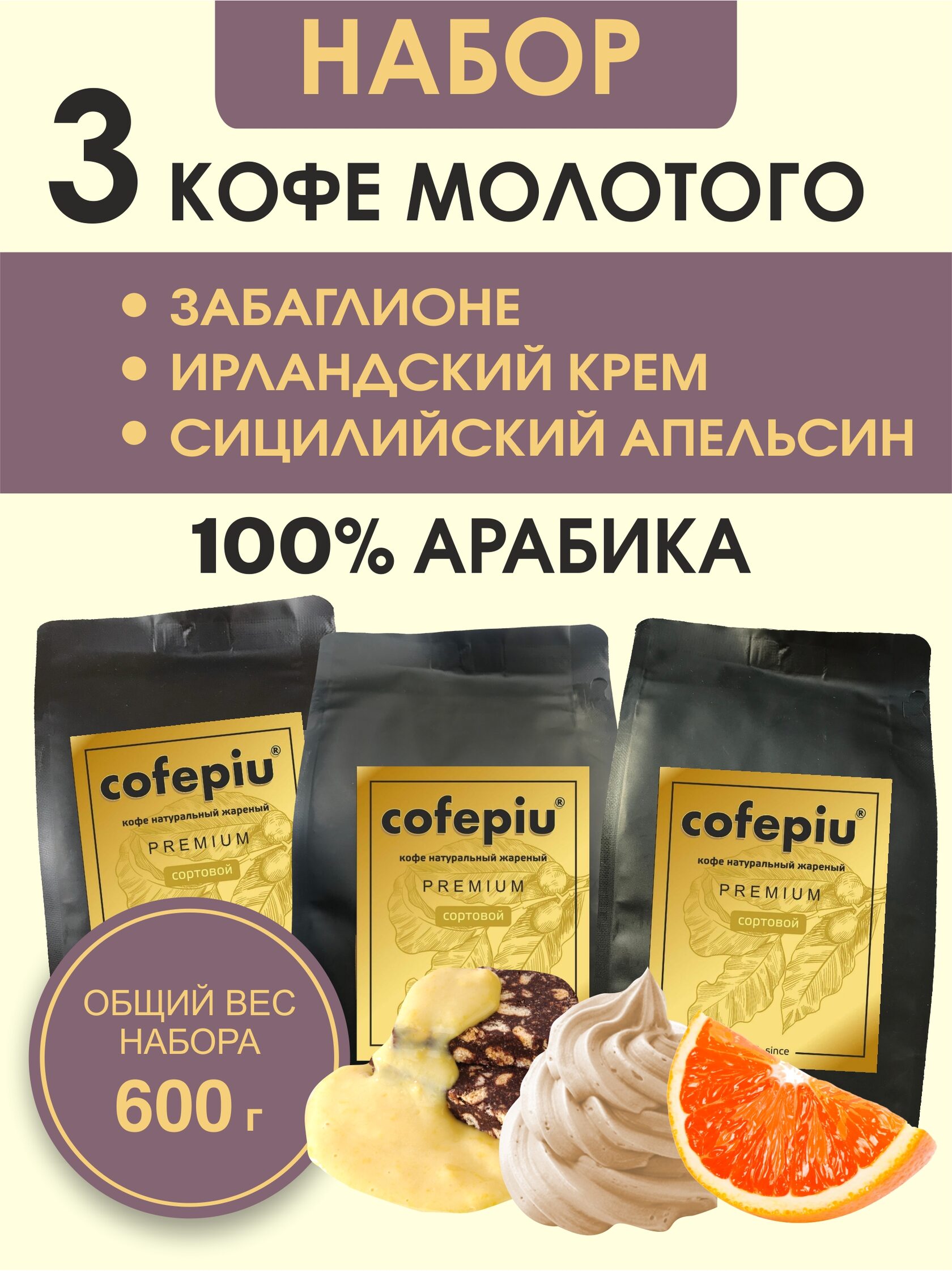 Начните лучший день с чашки кофе из ароматного набора молотого кофе из 3 пачек по 200 гр: Забаглионе, Ирландский Крем, Сицилийский Апельсин. В качестве основы для нашего ароматизированного кофе мы используем качественную арабику Бразилия Сантос с добавлением идентичных натуральным ароматизаторов. Гармоничный аромат, насыщен тонами орехов, а его низкая кислотность делает его отличным выбором для ценителей кофе. В послевкусии сливочные нотки в сочетании с орехово-шоколадными вкусом кофе с оттенками карамели. Напиток бодрит и повышает настроение. Средняя степень насыщенности напитка, послевкусие длительное и очень приятное. Фасовка подойдет для домашнего использования, для приготовления в офисе и в качестве подарка. Создан для любителей нежных и мягких напитков. Идеален для завтрака и обеденного перерыва. Кислотность напитка легкая, слабовыраженная. Степень обжарки - средняя. Молотый кофе подходит для кофемашины, для для турки, френч-пресса и кофеварки или просто заваривания в чашке. Coffee COFEPIU идеально подходит для приготовления латте, капучино, эспрессо и американо! Напиток можно пить без сахара, поэтому отлично подходит для покупателей, которые соблюдают правильное питание и диету. Для того чтобы максимально сохранить вкус и аромат свежеобжаренных зёрен, мы применяем в производстве упаковку с Zip-Lock замком -многократное открытие и закрытие для удобства хранения и использования. Его нужно открыть, потянув за специальный ключик-замок, он находится на обратной стороне, над клапаном дегазации, который гарантирует, что зерна были упакованы сразу после обжарки, соответственно, сохранили максимум аромата и эфирных масел. Вы всегда можете собрать подарочный набор из товаров, доступных в нашем магазине. Дарите наш кофе- это очень вкусный подарок! Мы желаем вам прекрасного настроения и приятных покупок! Кофе Кофепью