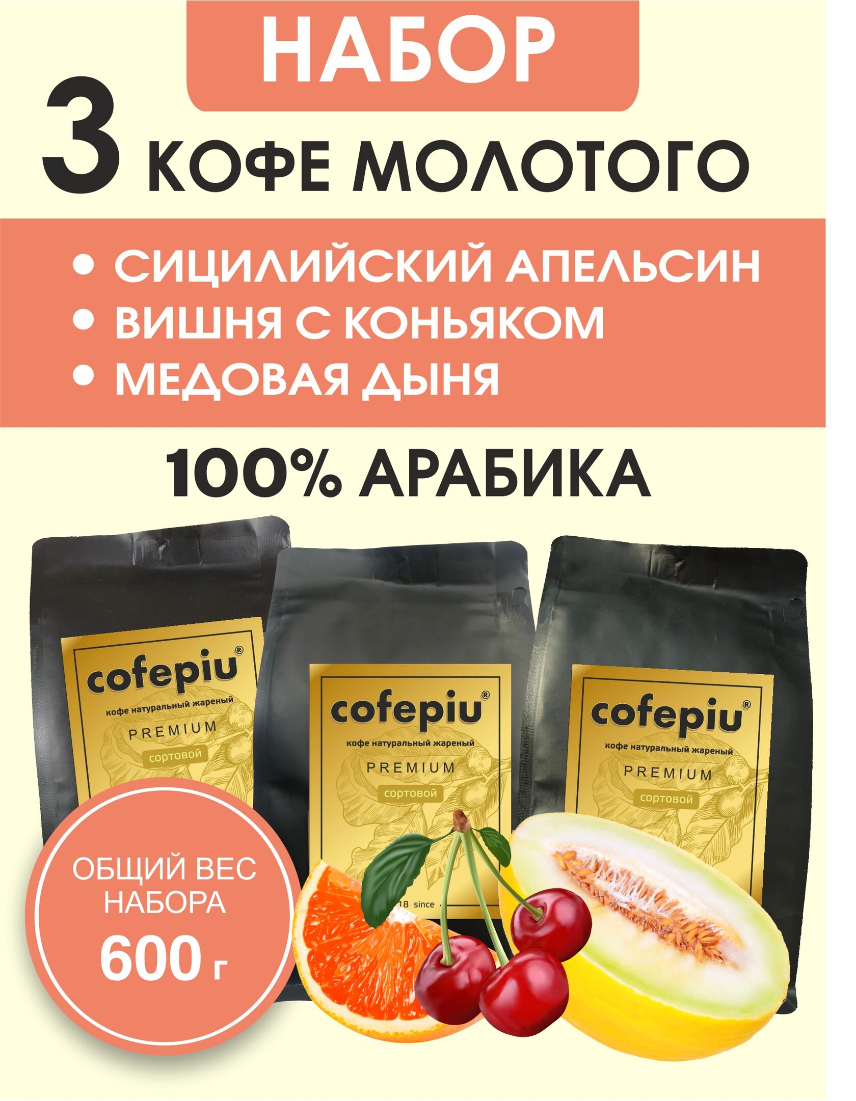 Набор кофе молотого 3 шт х 200 гр. Сицилийский Апельсин, Вишня с Коньяком, Медовая Дыня, арабика 100%